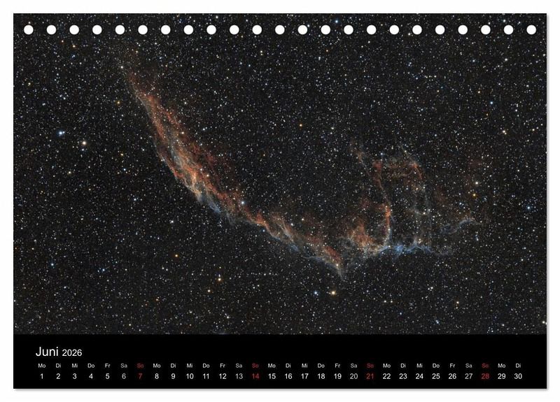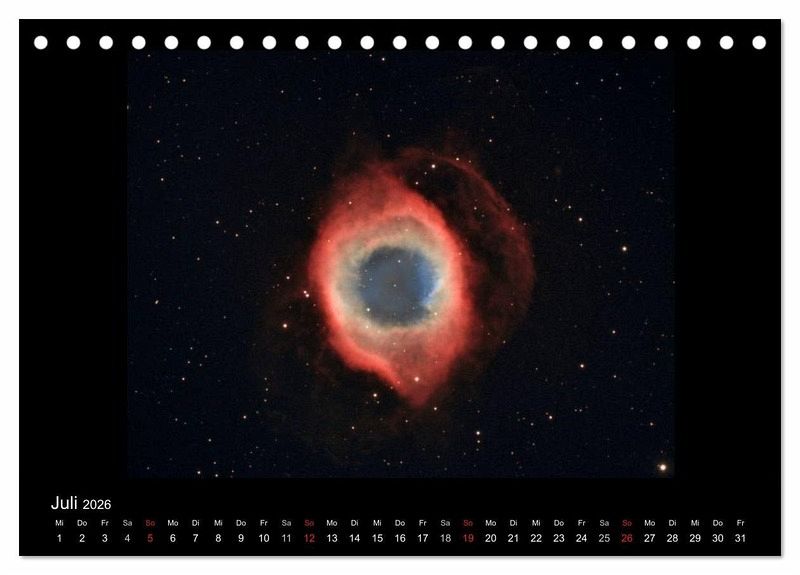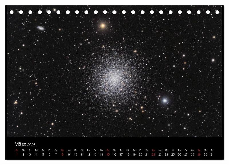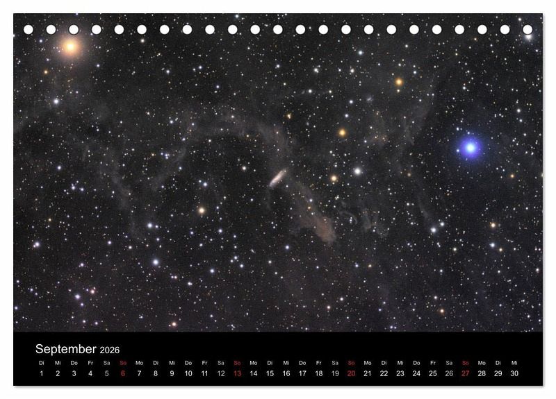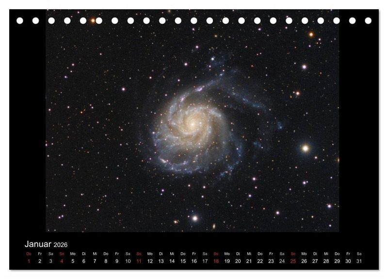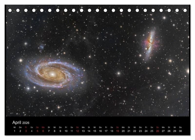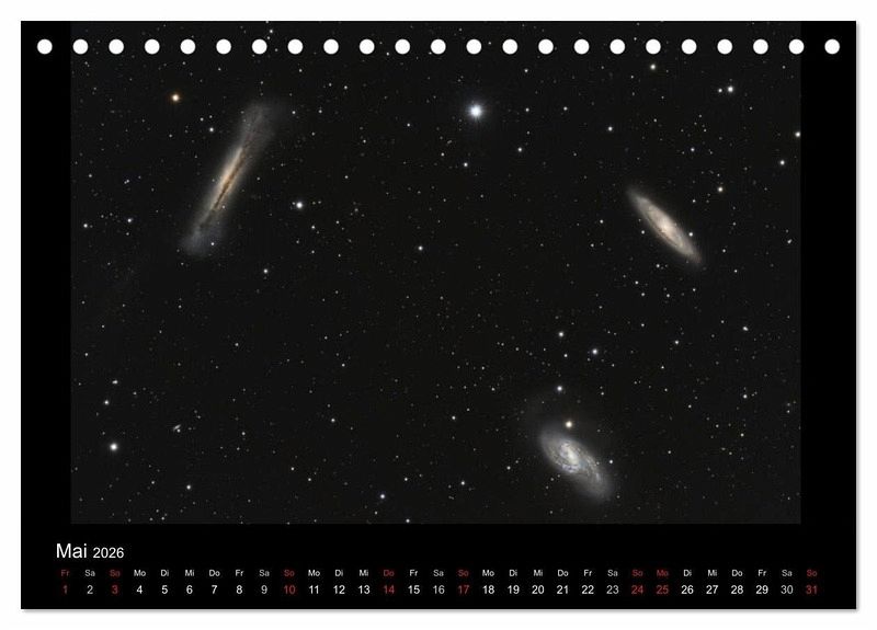 Dieser Kalender nimmt Sie mit auf eine Reise zu den majestätischen Materieansammlungen des Pferdekopfnebels und den Spiralarmen der Triangulumgalaxie, bis hin zu den wunderschönen, rund 35 Millionen Lichtjahren entfernten Galaxien des Leo Triplets.