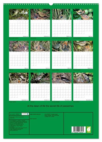 PREMIUM COLLECTION - Brilliant photo calendar with 12 beautiful motifs, high-gloss art print in museum quality.QUALITY - high-quality materials, sturdy back cover with 2 innovative insert pockets for optimum presentation on the wall.SUSTAINABLE - significant reduction in waste thanks to customised one-off production, environmentally friendly FSC-certified paper, production in Germany, climate-conscious logistics.PERFECT GIFT - calendars for friends and family, for children and adults, young and old, for Christmas, birthdays or in between.The secret life of our country birds von Autor(in): Alain Gaymard