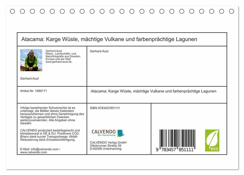 QUALITÄT - Hochwertiger Fotokalender mit 12 wunderschönen Motiven auf lichtbeständigem Bilderdruckpapier, robuste Spiralbindung.NACHHALTIG - deutliche Abfallreduzierung durch bedarfsgerechte Einzelstückfertigung, umweltfreundliches FSC-zertifiziertes Papier, Produktion in Deutschland, klimabewusste Logistik.PERFEKTES GESCHENK - Kalender für Freunde und Familie, für Kinder und Erwachsene, jung und alt, zu Weihnachten, Geburtstag oder zwischendurch.VIELFALT - Bildkalender in verschiedenen Formaten, z.B. DIN A5, DIN A4, DIN A3 sowie DIN A2. Ob Naturmotiv, Gemälde oder Fotos, ideal für ein persönliches Wohlfühlambiente.Atemberaubende Landschaften aus der trockensten Wüste der Erde von Autor(in): Gerhard Aust