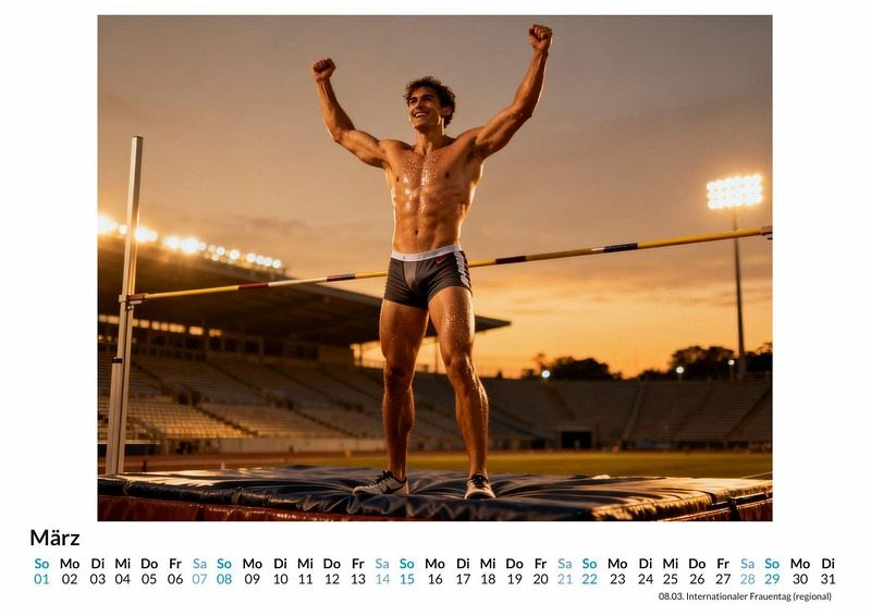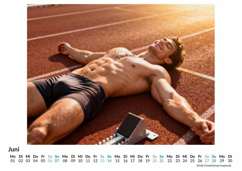 Der letzte Atemzug vor dem Ziel, die Muskeln brennen, der Schweiß rinnt. Dann der Moment des Triumphs. Der Kalender "Athletische Leichtathleten" fängt die rohe Energie und die Ästhetik des Sports ein, festgehalten in zwölf eindrucksvollen Monatsmotiven. Dieser Kalender ist eine ausgezeichnete Wahl: * Für Liebhaber der Leichtathletik und der damit verbundenen Dynamik. * Für alle, die eine Vorliebe für sportliche und ästhetische Körperdarstellungen haben. * Für jene, die eine besondere Art der Wandgestaltung suchen, die Kraft und Emotionen vereint. Jeder Monat zeigt einen Athleten in einem Moment voller Intensität. Ob in knappen Laufshorts in der Siegerpose oder nach dem Wettkampf erschöpft aber glücklich. Die Bilder konzentrieren sich auf die Kraft und die definierten Körper der Sportler. Diese Szenen wurden nicht mit einer Kamera eingefangen, sondern durch fortschrittliche Algorithmen zum Leben erweckt, um eine idealisierte Vision von Stärke und Ausdauer zu schaffen. Was der Kalender bietet: * Zwölf Monatsblätter mit Motiven von sportlichen Männern. * Ein praktisches Kalendarium für die Jahresplanung. * Eine Zusammenstellung von Bildern, die Stärke und Freude am Sport vermitteln. Dieser Kalender ist eine Hommage an die Disziplin und die Ästhetik des männlichen Körpers im Sport. Er begleitet durch das Jahr mit Bildern voller Energie und Ausdruckskraft. Eine Entdeckungsreise durch zwölf Monate voller sportlicher Momente wartet.