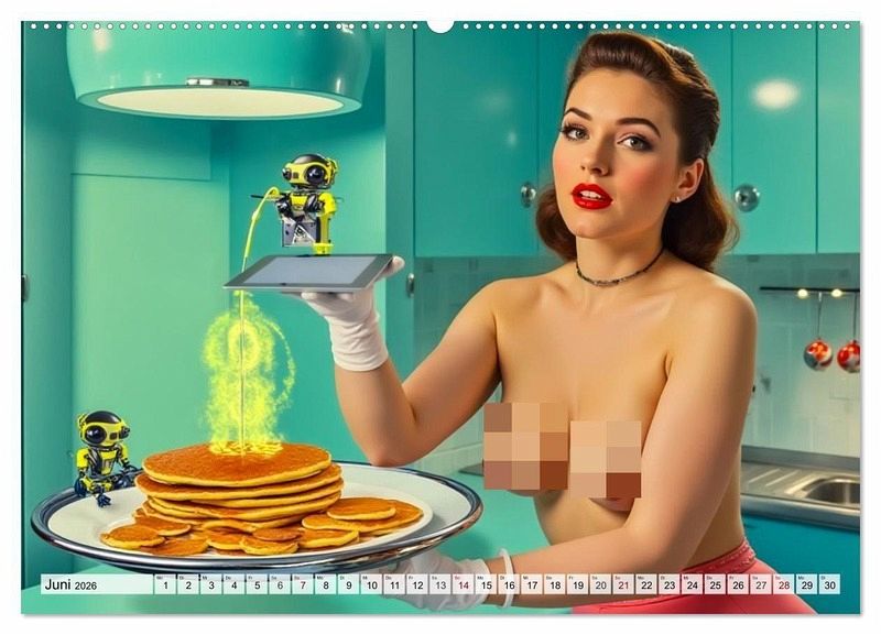 Ein stilvoller Retro-Futurismus-KI- Kalender, der den Charme klassischer 1950er-Jahre-Pin-ups mit visionärer Science-Fiction-Ästhetik verbindet.