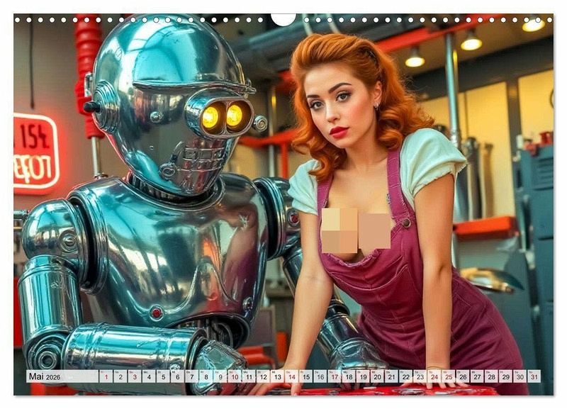 Ein stilvoller Retro-Futurismus-KI- Kalender, der den Charme klassischer 1950er-Jahre-Pin-ups mit visionärer Science-Fiction-Ästhetik verbindet.