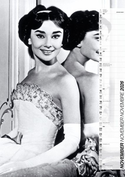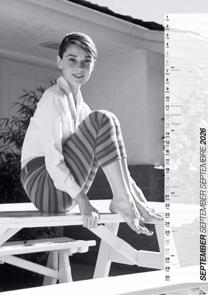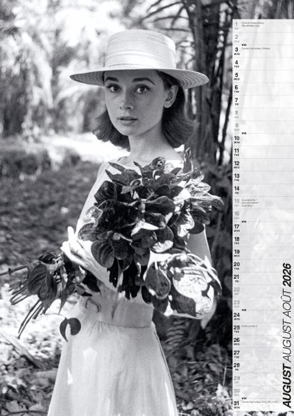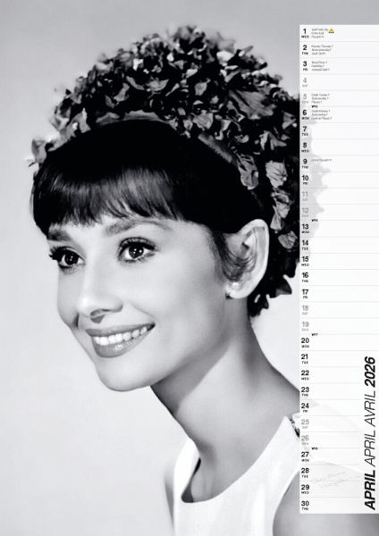 Audrey Hepburn ist eine der größten Stil-Ikonen des 20. Jahrhunderts. Filme wie Sabrina, Frühstück bei Tiffany oder Charade machten sie bereits zu Lebzeiten unsterblich. Ihr Kalender ist Glamour pur für das kommende Jahr - mit 14 ausgesuchten Hochglanz-Aufnahmen aus dem Privatarchiv des Weltstars. Inklusive aller gesetzlichen und religiösen Feiertage, Mondphasen, Sommer/Winterzeit und einem breiten Nutzkalendarium für eigene Termine und Eintragungen.