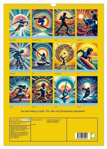 Unser einzigartiger Kalender vereint die Faszination der olympischen Sportarten mit kunstvoller Gestaltung. Jedes Monatsblatt präsentiert beeindruckende, kreative Illustrationen und kunstvolle Darstellungen der Athleten in Aktion - ein echter Blickfang für dein Zuhause oder Büro.