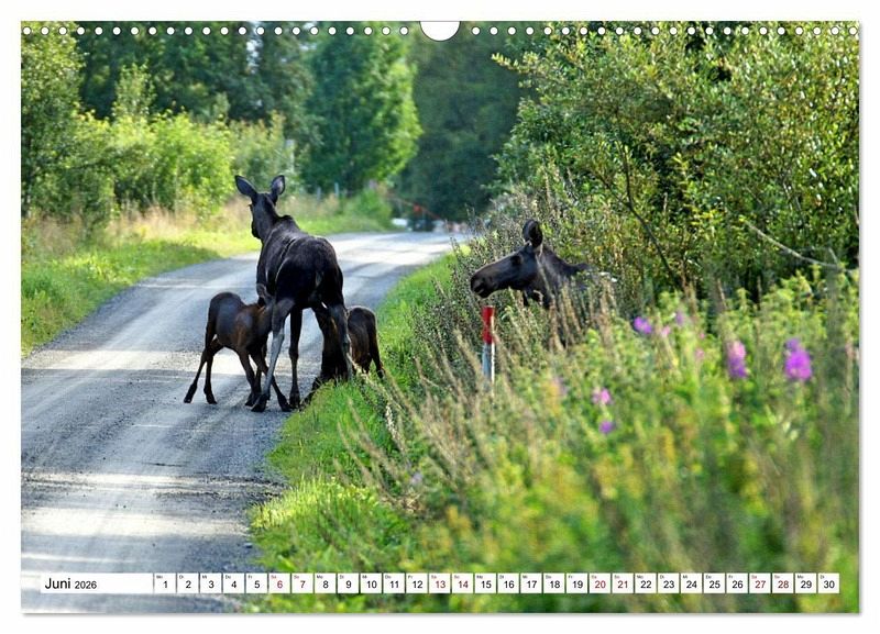 Juni: Elchkühe mit Kälbern kreuzen die Straße