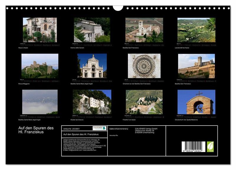QUALITÄT - Hochwertiger Fotokalender mit 12 wunderschönen Motiven auf lichtbeständigem Bilderdruckpapier, robuste Spiralbindung mit Aufhängebügel.NACHHALTIG - deutliche Abfallreduzierung durch bedarfsgerechte Einzelstückfertigung, umweltfreundliches FSC-zertifiziertes Papier, Produktion in Deutschland, klimabewusste Logistik.PERFEKTES GESCHENK - Kalender für Freunde und Familie, für Kinder und Erwachsene, jung und alt, zu Weihnachten, Geburtstag oder zwischendurch.VIELFALT - Bildkalender in verschiedenen Formaten, z.B. DIN A5, DIN A4, DIN A3 sowie DIN A2. Ob Naturmotiv, Gemälde oder Fotos, ideal für ein persönliches Wohlfühlambiente.Begleiten Sie Franziskus an die Orte seines Wirkens in Assisi und Umgebung von Autor(in): Veronika Rix