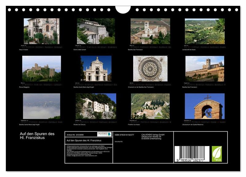 QUALITÄT - Hochwertiger Fotokalender mit 12 wunderschönen Motiven auf lichtbeständigem Bilderdruckpapier, robuste Spiralbindung mit Aufhängebügel.NACHHALTIG - deutliche Abfallreduzierung durch bedarfsgerechte Einzelstückfertigung, umweltfreundliches FSC-zertifiziertes Papier, Produktion in Deutschland, klimabewusste Logistik.PERFEKTES GESCHENK - Kalender für Freunde und Familie, für Kinder und Erwachsene, jung und alt, zu Weihnachten, Geburtstag oder zwischendurch.VIELFALT - Bildkalender in verschiedenen Formaten, z.B. DIN A5, DIN A4, DIN A3 sowie DIN A2. Ob Naturmotiv, Gemälde oder Fotos, ideal für ein persönliches Wohlfühlambiente.Begleiten Sie Franziskus an die Orte seines Wirkens in Assisi und Umgebung von Autor(in): Veronika Rix