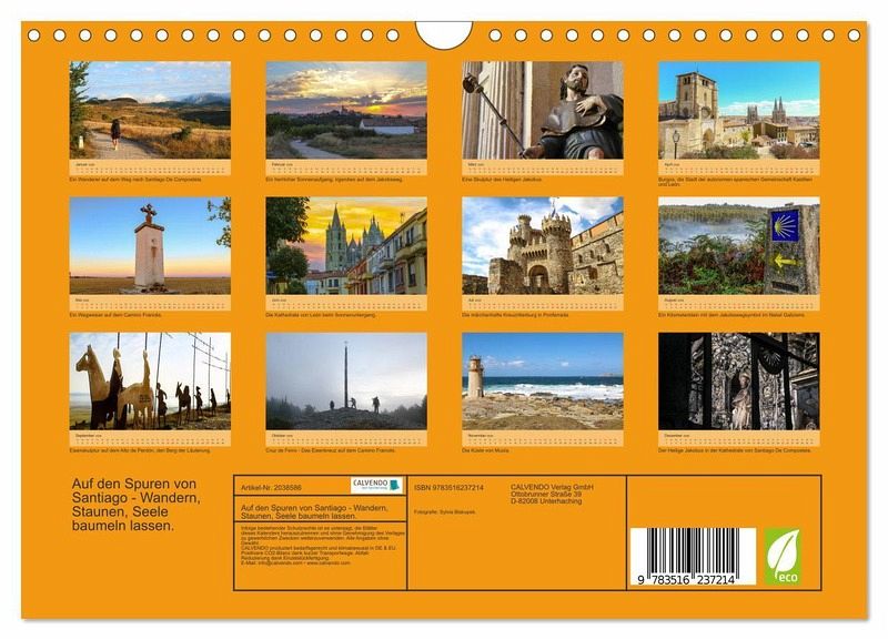 Entfliehen Sie dem Stress und lassen Sie sich für einen kurzen Moment von dem Zauber des Jakobsweg mitreißen. Jeden Monat erhalten Sie einen kleinen Einblick auf die unbeschreiblich schöne und abwechslungsreiche Landschaft des Camino De Santiago. Dieser Kalender ist ein perfektes Geschenk für alle Freunde des Wanderns und solche die es noch werden wollen.