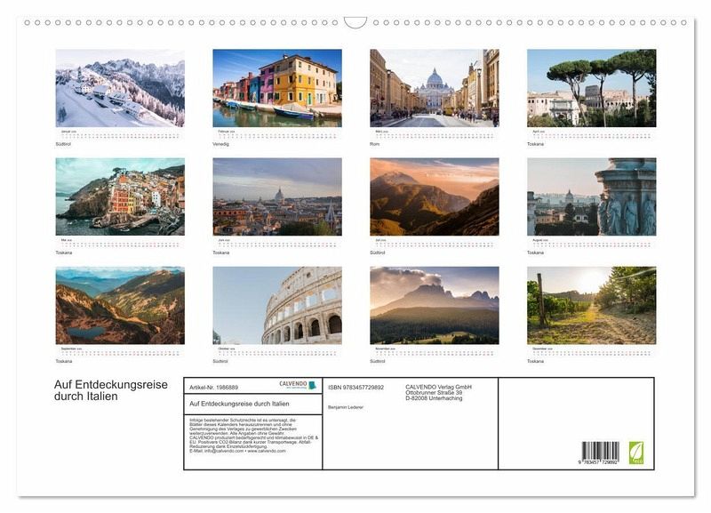 QUALITÄT - Hochwertiger Fotokalender mit 12 wunderschönen Motiven auf lichtbeständigem Bilderdruckpapier, robuste Spiralbindung mit Aufhängebügel.NACHHALTIG - deutliche Abfallreduzierung durch bedarfsgerechte Einzelstückfertigung, umweltfreundliches FSC-zertifiziertes Papier, Produktion in Deutschland, klimabewusste Logistik.PERFEKTES GESCHENK - Kalender für Freunde und Familie, für Kinder und Erwachsene, jung und alt, zu Weihnachten, Geburtstag oder zwischendurch.VIELFALT - Bildkalender in verschiedenen Formaten, z.B. DIN A5, DIN A4, DIN A3 sowie DIN A2. Ob Naturmotiv, Gemälde oder Fotos, ideal für ein persönliches Wohlfühlambiente.Eine wundervolle Reise nach Italien. von Autor(in): Benjamin Lederer