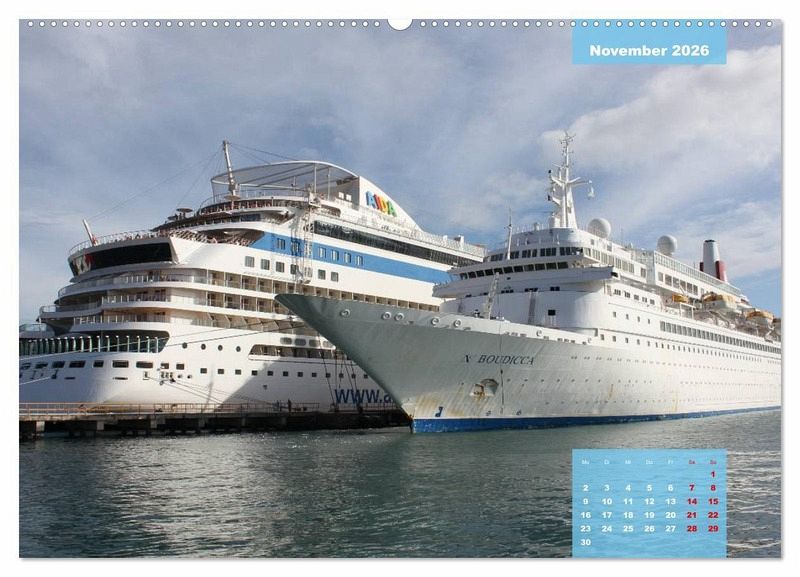 Der perfekte Kalender für Fans von Kreuzfahrten! Lassen Sie sich mit diesen Schiffen durch das Jahr begleiten: AIDAluna, Boudicca, Nieuw Amsterdam, Azura, Saga Sapphire und Ventura. Die Fotos entstanden in der Karibik. Neuauflage mit aktualisiertem Design.