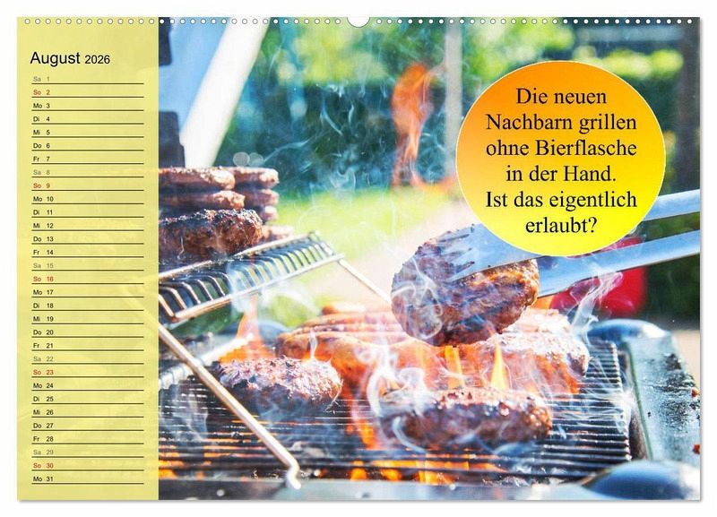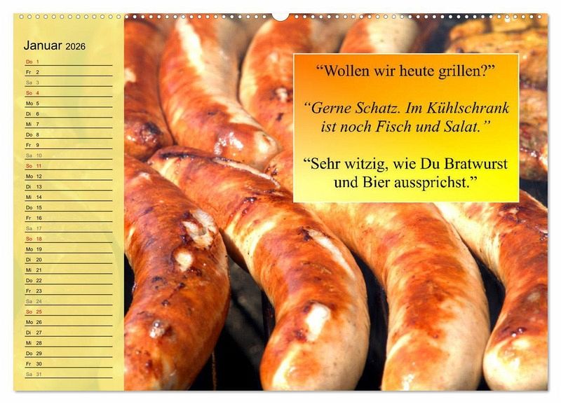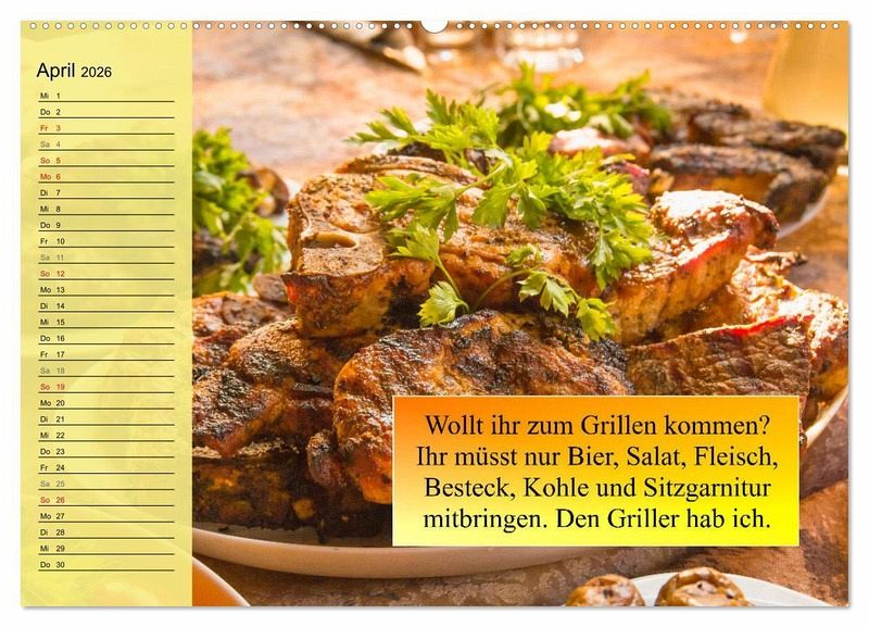 Grillen geht immer! Ein lustiger Grill-Kalender mit schönen Bildern von lecker und knusprig gegrillten Würstchen, Frikadellen und Fleisch. Mit witzigen Sprüchen versehen, ist er ein perfektes Geschenk für alle Grillmeister. Zudem gibt es viel Platz für Notizen und Termine, um anstehende Grillfeste und gemütliche Abende am Feuer nicht zu vergessen.