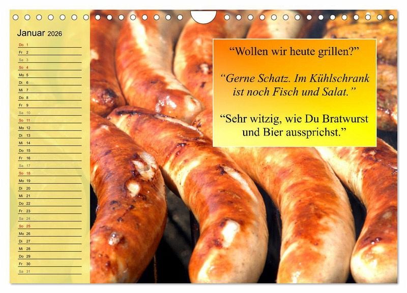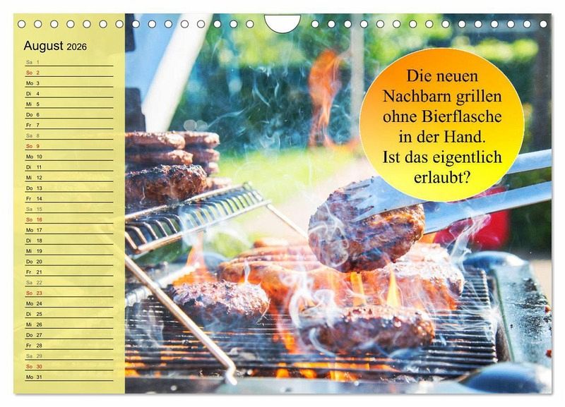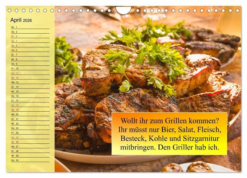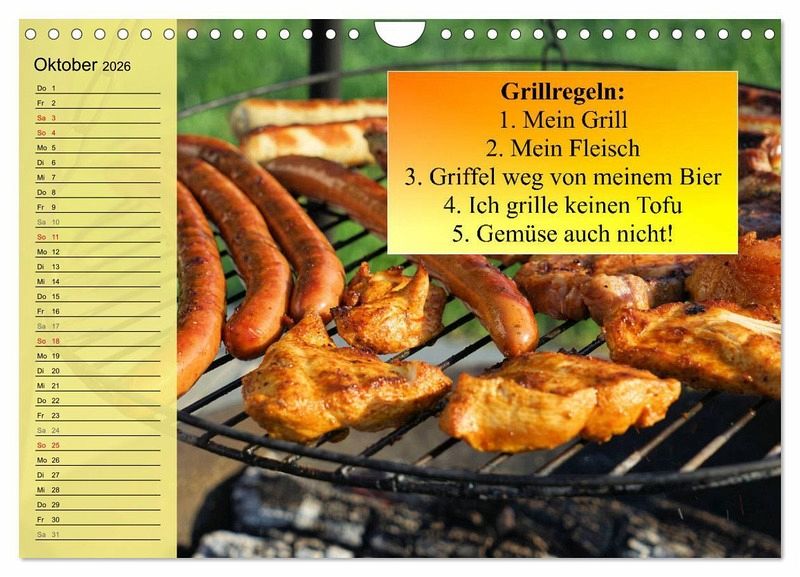 Grillen geht immer! Ein lustiger Grill-Kalender mit schönen Bildern von lecker und knusprig gegrillten Würstchen, Frikadellen und Fleisch. Mit witzigen Sprüchen versehen, ist er ein perfektes Geschenk für alle Grillmeister. Zudem gibt es viel Platz für Notizen und Termine, um anstehende Grillfeste und gemütliche Abende am Feuer nicht zu vergessen.