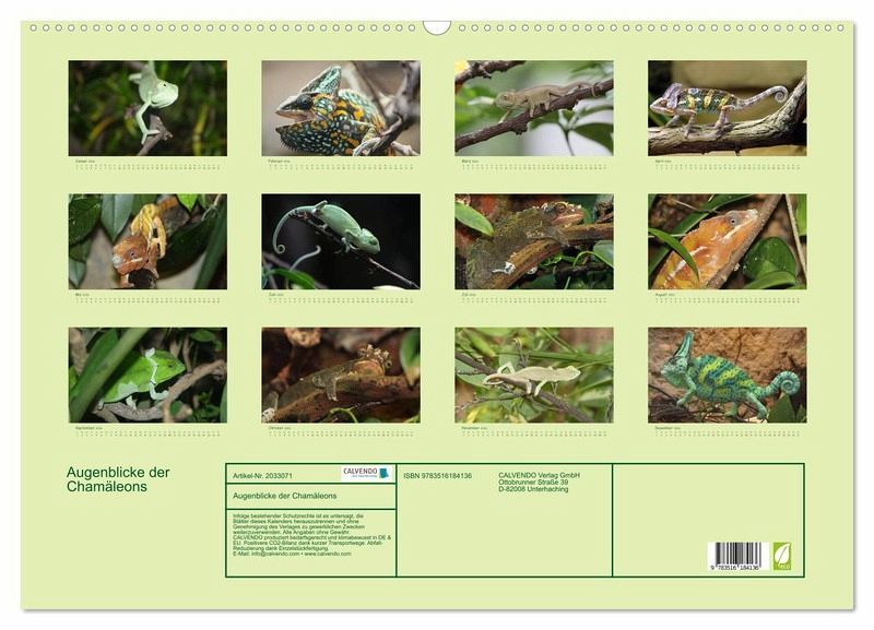 QUALITÄT - Hochwertiger Fotokalender mit 12 wunderschönen Motiven auf lichtbeständigem Bilderdruckpapier, robuste Spiralbindung mit Aufhängebügel.NACHHALTIG - deutliche Abfallreduzierung durch bedarfsgerechte Einzelstückfertigung, umweltfreundliches FSC-zertifiziertes Papier, Produktion in Deutschland, klimabewusste Logistik.PERFEKTES GESCHENK - Kalender für Freunde und Familie, für Kinder und Erwachsene, jung und alt, zu Weihnachten, Geburtstag oder zwischendurch.VIELFALT - Bildkalender in verschiedenen Formaten, z.B. DIN A5, DIN A4, DIN A3 sowie DIN A2. Ob Naturmotiv, Gemälde oder Fotos, ideal für ein persönliches Wohlfühlambiente.Augenblicke aus dem Leben von Chamäleons von Autor(in): Barbara Mielewczyk