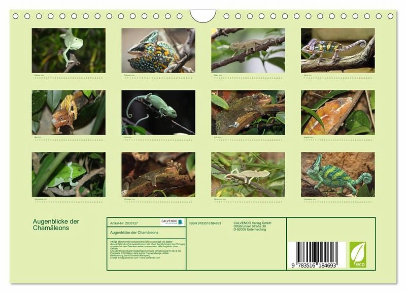 QUALITÄT - Hochwertiger Fotokalender mit 12 wunderschönen Motiven auf lichtbeständigem Bilderdruckpapier, robuste Spiralbindung mit Aufhängebügel.NACHHALTIG - deutliche Abfallreduzierung durch bedarfsgerechte Einzelstückfertigung, umweltfreundliches FSC-zertifiziertes Papier, Produktion in Deutschland, klimabewusste Logistik.PERFEKTES GESCHENK - Kalender für Freunde und Familie, für Kinder und Erwachsene, jung und alt, zu Weihnachten, Geburtstag oder zwischendurch.VIELFALT - Bildkalender in verschiedenen Formaten, z.B. DIN A5, DIN A4, DIN A3 sowie DIN A2. Ob Naturmotiv, Gemälde oder Fotos, ideal für ein persönliches Wohlfühlambiente.Augenblicke aus dem Leben von Chamäleons von Autor(in): Barbara Mielewczyk