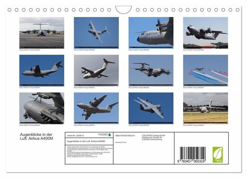 QUALITÄT - Hochwertiger Fotokalender mit 12 wunderschönen Motiven auf lichtbeständigem Bilderdruckpapier, robuste Spiralbindung mit Aufhängebügel.NACHHALTIG - deutliche Abfallreduzierung durch bedarfsgerechte Einzelstückfertigung, umweltfreundliches FSC-zertifiziertes Papier, Produktion in Deutschland, klimabewusste Logistik.PERFEKTES GESCHENK - Kalender für Freunde und Familie, für Kinder und Erwachsene, jung und alt, zu Weihnachten, Geburtstag oder zwischendurch.VIELFALT - Bildkalender in verschiedenen Formaten, z.B. DIN A5, DIN A4, DIN A3 sowie DIN A2. Ob Naturmotiv, Gemälde oder Fotos, ideal für ein persönliches Wohlfühlambiente.Bilder des Airbus A400M Prototypen von Autor(in): Aleksandar Prokic
