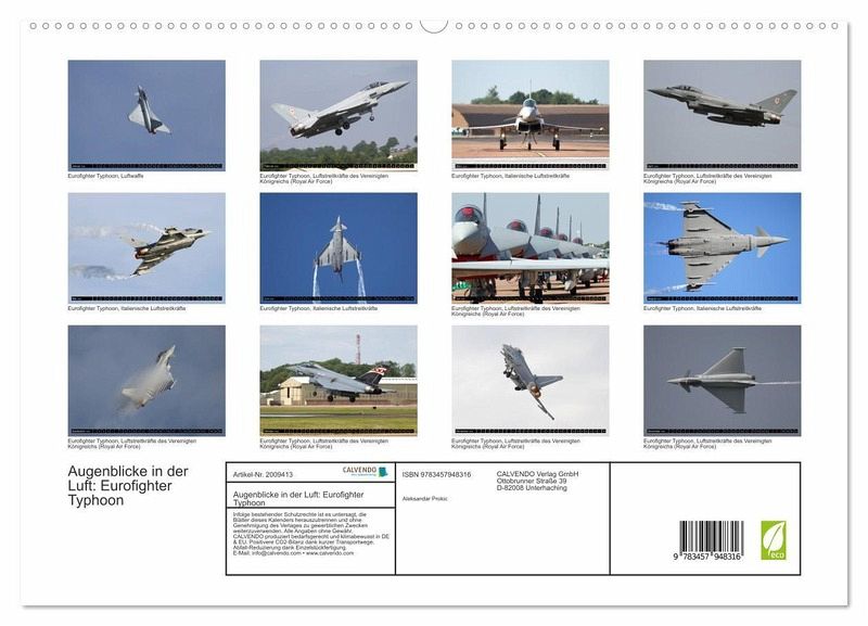 PREMIUM-LINIE - Brillanter Fotokalender mit 12 wunderschönen Motiven, Kunstdruck in Hochglanz in Museumsqualität.QUALITÄT - edle Materialien, stabile Rückwand mit 2 innovativen Einstecktaschen für eine optimale Präsentation an der Wand.NACHHALTIG - deutliche Abfallreduzierung durch bedarfsgerechte Einzelstückfertigung, umweltfreundliches FSC-zertifiziertes Papier, Produktion in Deutschland, klimabewusste Logistik.PERFEKTES GESCHENK - Kalender für Freunde und Familie, für Kinder und Erwachsene, jung und alt, zu Weihnachten, Geburtstag oder zwischendurch.Eurofighter Typhoon aus verschiedenen Perspektiven in Aktion von Autor(in): Aleksandar Prokic
