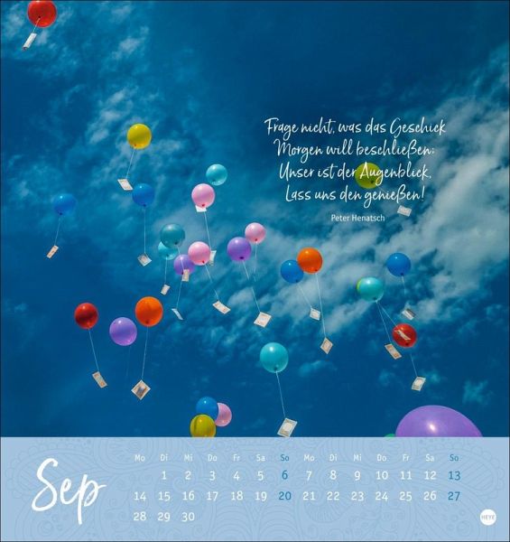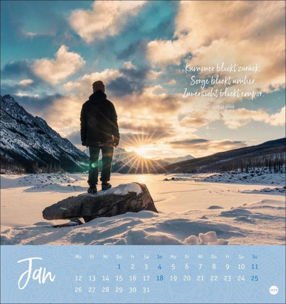 - Innehalten und frischen Optimismus tanken: Der kleine Kalender für den Schreibtisch hält Monat für Monat aufmunternde Worte bereit- Impulse für mehr Achtsamkeit im Büro und zuhause: So stärken Sie Ihr positives Denken!- Ein Plädoyer für Zuversicht: Kalender mit inspirierenden Zitaten und wunderschönen Naturaufnahmen zum Sammeln und Verschicken- Der Sprüche-Kalender im Postkartenformat 16 x 17 cm für alle, die Kraft aus der Natur und klugen Worten schöpfen- Zaubert Optimismus auch in Ihren Alltag: Die Tischkalender von Heye im Athesia Kalenderverlag
