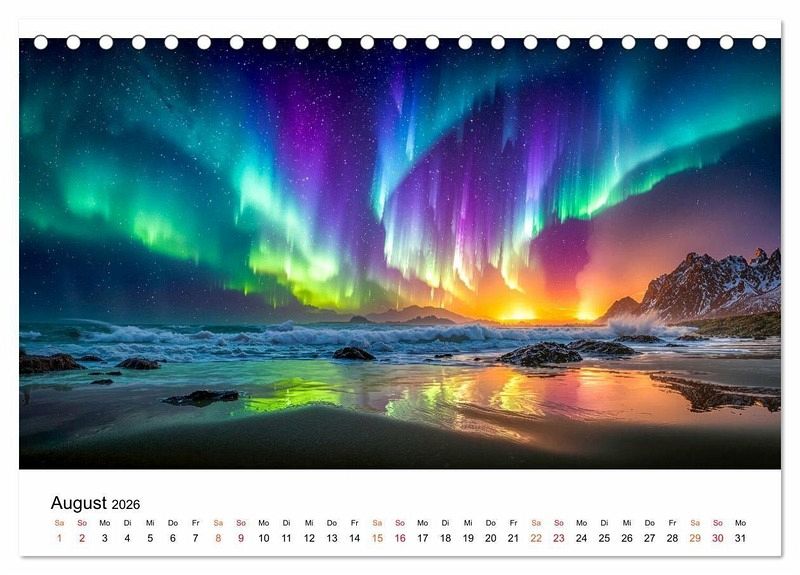 Tauchen Sie ein in die Magie der nördlichsten Nächte - von zarten grünen Schleiern bis zu kraftvoll tanzenden Lichtbändern, die wie flüssige Magie über den Himmel ziehen. Dieser Kalender zeigt das Polarlicht in all seinen Facetten, leuchtend über dem endlosen Polarmeer oder schimmernd vor majestätischen Eisbergen, aber auch geheimnisvoll im roten Schein der untergehenden Sonne und als funkelnde Krone über der stillen Winterlandschaft. Gestaltet mit dem Auge fürs Detail bringen diese Bilder Ihnen die Wunder des hohen Nordens näher, wobei die grafische Umsetzung im Zusammenspiel klassischer Gestaltung und ausgewählter KI-basierter Methoden erfolgte. Perfekt für alle Naturliebhaber und -liebhaberinnen, Skandinavien- und Polarlichterfans.
