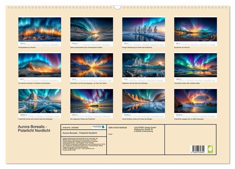 Tauchen Sie ein in die Magie der nördlichsten Nächte - von zarten grünen Schleiern bis zu kraftvoll tanzenden Lichtbändern, die wie flüssige Magie über den Himmel ziehen. Dieser Kalender zeigt das Polarlicht in all seinen Facetten, leuchtend über dem endlosen Polarmeer oder schimmernd vor majestätischen Eisbergen, aber auch geheimnisvoll im roten Schein der untergehenden Sonne und als funkelnde Krone über der stillen Winterlandschaft. Gestaltet mit dem Auge fürs Detail bringen diese Bilder Ihnen die Wunder des hohen Nordens näher, wobei die grafische Umsetzung im Zusammenspiel klassischer Gestaltung und ausgewählter KI-basierter Methoden erfolgte. Perfekt für alle Naturliebhaber und -liebhaberinnen, Skandinavien- und Polarlichterfans.