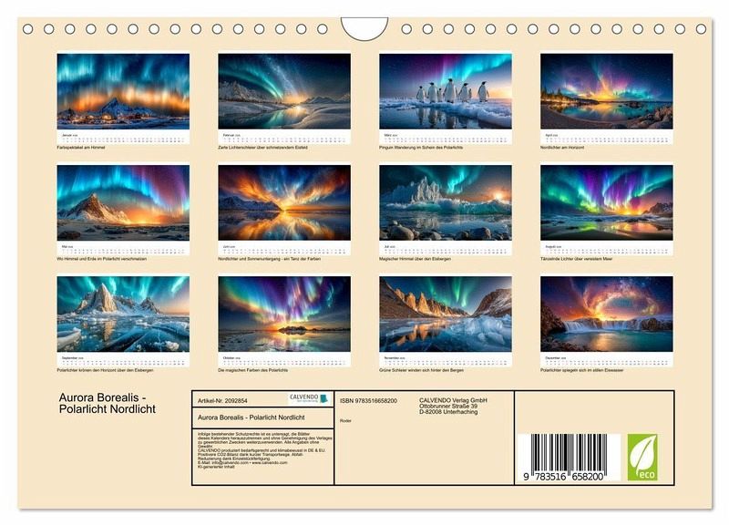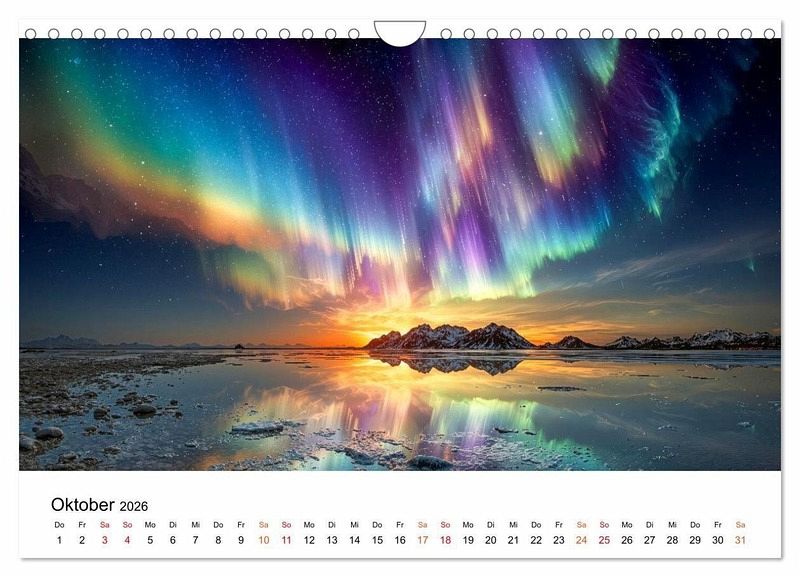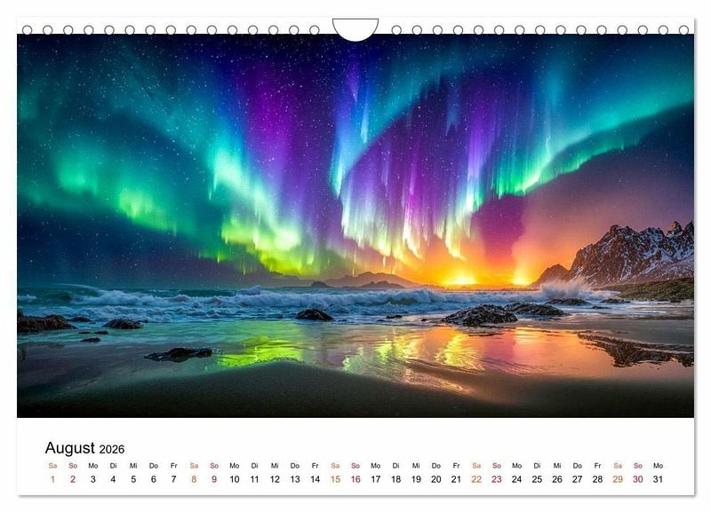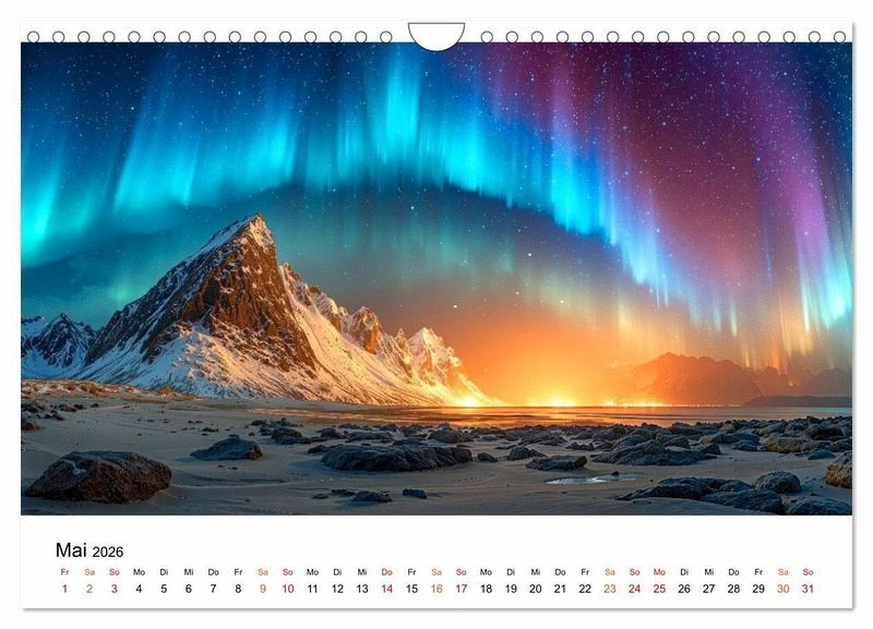 Tauchen Sie ein in die Magie der nördlichsten Nächte - von zarten grünen Schleiern bis zu kraftvoll tanzenden Lichtbändern, die wie flüssige Magie über den Himmel ziehen. Dieser Kalender zeigt das Polarlicht in all seinen Facetten, leuchtend über dem endlosen Polarmeer oder schimmernd vor majestätischen Eisbergen, aber auch geheimnisvoll im roten Schein der untergehenden Sonne und als funkelnde Krone über der stillen Winterlandschaft. Gestaltet mit dem Auge fürs Detail bringen diese Bilder Ihnen die Wunder des hohen Nordens näher, wobei die grafische Umsetzung im Zusammenspiel klassischer Gestaltung und ausgewählter KI-basierter Methoden erfolgte. Perfekt für alle Naturliebhaber und -liebhaberinnen, Skandinavien- und Polarlichterfans.