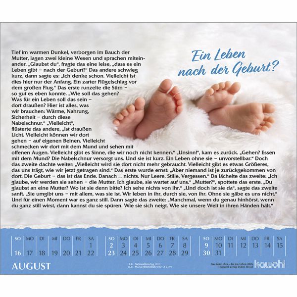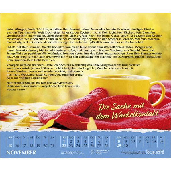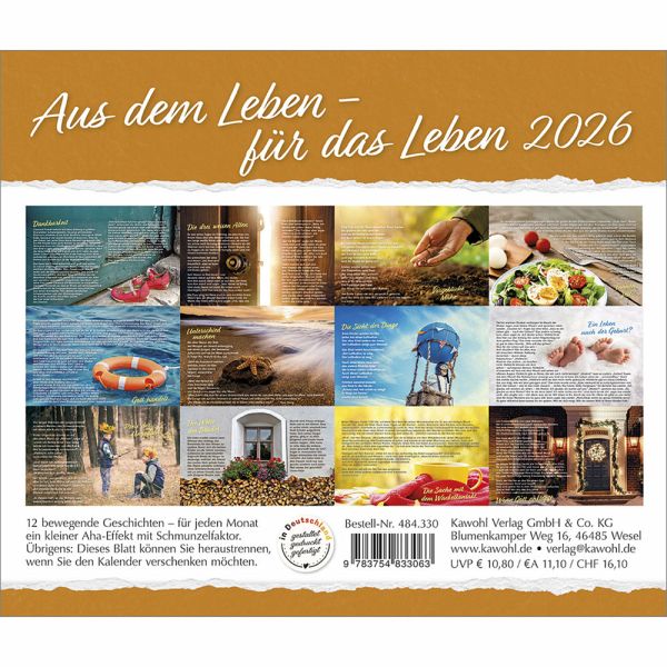 Postkartenkalender mit Geschichten 'aus dem Leben'!"Aus dem Leben - für das Leben"Ein Kalender, der zum Verweilen einlädt.Jedes Kalenderblatt erzählt eine bewegende Kurzgeschichte aus dem Alltag, die uns manches praktisch verständlich macht. Einprägsame Beispielerzählungen sind verbunden mit symbolstarken Bildern. Erfreuendes und Nachdenkliches für Leser und Betrachter aller Altersgruppen.Postkarten-Kalender mit Postkarten im Super-Bild-Format:- mit bewegenden Kurzgeschichten- mit symbolstarken Farbfotos- Postkartenkarton