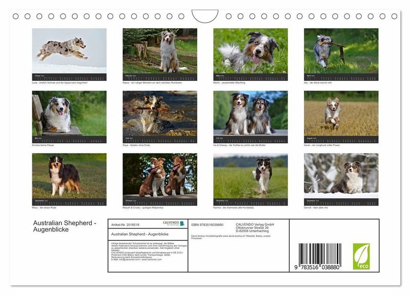 QUALITÄT - Hochwertiger Fotokalender mit 12 wunderschönen Motiven auf lichtbeständigem Bilderdruckpapier, robuste Spiralbindung mit Aufhängebügel.NACHHALTIG - deutliche Abfallreduzierung durch bedarfsgerechte Einzelstückfertigung, umweltfreundliches FSC-zertifiziertes Papier, Produktion in Deutschland, klimabewusste Logistik.PERFEKTES GESCHENK - Kalender für Freunde und Familie, für Kinder und Erwachsene, jung und alt, zu Weihnachten, Geburtstag oder zwischendurch.VIELFALT - Bildkalender in verschiedenen Formaten, z.B. DIN A5, DIN A4, DIN A3 sowie DIN A2. Ob Naturmotiv, Gemälde oder Fotos, ideal für ein persönliches Wohlfühlambiente.Faszination Australian Shepherd - Berührende Augenblicke begleiten Sie durchs ganze Jahr von Autor(in): David Andrey