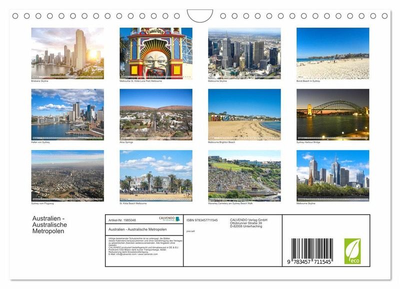Der Kalender nimmt Sie mit auf eine eindrucksvolle Reise von der Mini-Metropole Alice Springs mitten im roten Herzen des Northern Territory über das eindrucksvolle Brisbane in Queensland, bis hin zu den weltberühmten Riesenstädten Sydney und Melbourne. Der Kalender zeigt Ihnen eine Auswahl der eindrucksvollsten, aber auch schönster Seiten der australischen Großstädte.