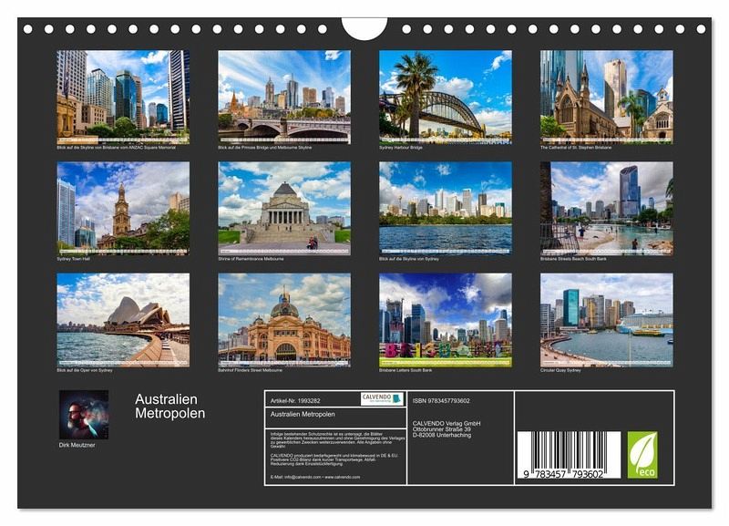 QUALITÄT - Hochwertiger Fotokalender mit 12 wunderschönen Motiven auf lichtbeständigem Bilderdruckpapier, robuste Spiralbindung mit Aufhängebügel.NACHHALTIG - deutliche Abfallreduzierung durch bedarfsgerechte Einzelstückfertigung, umweltfreundliches FSC-zertifiziertes Papier, Produktion in Deutschland, klimabewusste Logistik.PERFEKTES GESCHENK - Kalender für Freunde und Familie, für Kinder und Erwachsene, jung und alt, zu Weihnachten, Geburtstag oder zwischendurch.VIELFALT - Bildkalender in verschiedenen Formaten, z.B. DIN A5, DIN A4, DIN A3 sowie DIN A2. Ob Naturmotiv, Gemälde oder Fotos, ideal für ein persönliches Wohlfühlambiente.Zwölf einmalige Bilder der Metropolen Australiens von Autor(in): Dirk Meutzner