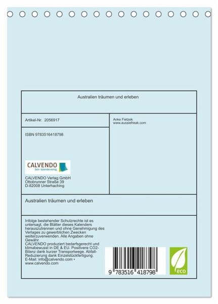QUALITÄT - Hochwertiger Fotokalender mit 12 wunderschönen Motiven auf lichtbeständigem Bilderdruckpapier, robuste Spiralbindung.NACHHALTIG - deutliche Abfallreduzierung durch bedarfsgerechte Einzelstückfertigung, umweltfreundliches FSC-zertifiziertes Papier, Produktion in Deutschland, klimabewusste Logistik.PERFEKTES GESCHENK - Kalender für Freunde und Familie, für Kinder und Erwachsene, jung und alt, zu Weihnachten, Geburtstag oder zwischendurch.VIELFALT - Bildkalender in verschiedenen Formaten, z.B. DIN A5, DIN A4, DIN A3 sowie DIN A2. Ob Naturmotiv, Gemälde oder Fotos, ideal für ein persönliches Wohlfühlambiente.Bunte Eindrücke aus Australien von Autor(in): Aussiefreak