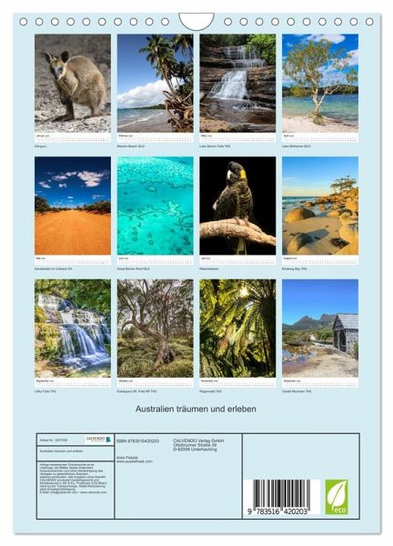 QUALITÄT - Hochwertiger Fotokalender mit 12 wunderschönen Motiven auf lichtbeständigem Bilderdruckpapier, robuste Spiralbindung mit Aufhängebügel.NACHHALTIG - deutliche Abfallreduzierung durch bedarfsgerechte Einzelstückfertigung, umweltfreundliches FSC-zertifiziertes Papier, Produktion in Deutschland, klimabewusste Logistik.PERFEKTES GESCHENK - Kalender für Freunde und Familie, für Kinder und Erwachsene, jung und alt, zu Weihnachten, Geburtstag oder zwischendurch.VIELFALT - Bildkalender in verschiedenen Formaten, z.B. DIN A5, DIN A4, DIN A3 sowie DIN A2. Ob Naturmotiv, Gemälde oder Fotos, ideal für ein persönliches Wohlfühlambiente.Bunte Eindrücke aus Australien von Autor(in): Aussiefreak