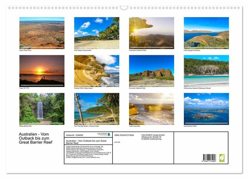 Kommen Sie mit auf eine eindrucksvolle Reise von der Grünen Nordküste des Northern Territory und Queensland, über das rote Herz Australien in South Australia, zum milden Klima in Victoria und schließlich ins raue Tasmanien. Regenwald, Wüste, Wasserfälle, endlose Weiten Sandstrände, schroffe Küsten und das Great Barrier Reef es scheint nichts zu geben was Australien nicht zu bieten hat und die-ser Kalender möchte Ihnen möglichst viel davon zeigen.