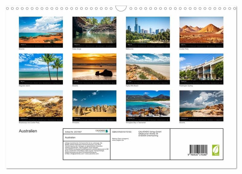 QUALITÄT - Hochwertiger Fotokalender mit 12 wunderschönen Motiven auf lichtbeständigem Bilderdruckpapier, robuste Spiralbindung mit Aufhängebügel.NACHHALTIG - deutliche Abfallreduzierung durch bedarfsgerechte Einzelstückfertigung, umweltfreundliches FSC-zertifiziertes Papier, Produktion in Deutschland, klimabewusste Logistik.PERFEKTES GESCHENK - Kalender für Freunde und Familie, für Kinder und Erwachsene, jung und alt, zu Weihnachten, Geburtstag oder zwischendurch.VIELFALT - Bildkalender in verschiedenen Formaten, z.B. DIN A5, DIN A4, DIN A3 sowie DIN A2. Ob Naturmotiv, Gemälde oder Fotos, ideal für ein persönliches Wohlfühlambiente.Ansichten aus Australien von Autor(in): magann