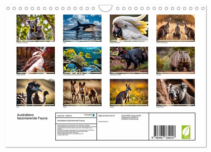 QUALITÄT - Hochwertiger Fotokalender mit 12 wunderschönen Motiven auf lichtbeständigem Bilderdruckpapier, robuste Spiralbindung mit Aufhängebügel.NACHHALTIG - deutliche Abfallreduzierung durch bedarfsgerechte Einzelstückfertigung, umweltfreundliches FSC-zertifiziertes Papier, Produktion in Deutschland, klimabewusste Logistik.PERFEKTES GESCHENK - Kalender für Freunde und Familie, für Kinder und Erwachsene, jung und alt, zu Weihnachten, Geburtstag oder zwischendurch.VIELFALT - Bildkalender in verschiedenen Formaten, z.B. DIN A5, DIN A4, DIN A3 sowie DIN A2. Ob Naturmotiv, Gemälde oder Fotos, ideal für ein persönliches Wohlfühlambiente.Beeindruckende Tierwelt zu Land, in der Luft und im Meer von Autor(in): Claudia Kleemann