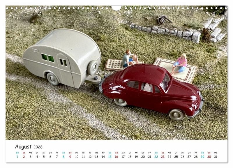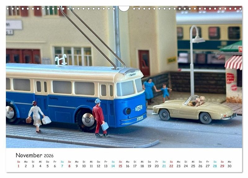 Modellautos waren von jeher unverzichtbar für die realistische Gestaltung von Modellbahnanlagen. Ursprünglich nur Zubehör, entwickelten sich die Miniaturautos bald zum eigenständigen und beliebten Sammelgebiet. In unserem Kalender sind sie in typischen Straßenszenen zu sehen.