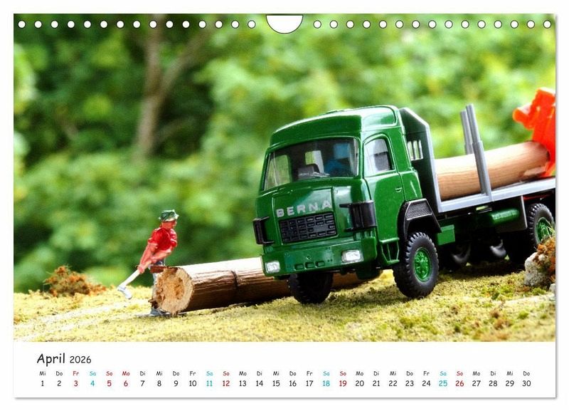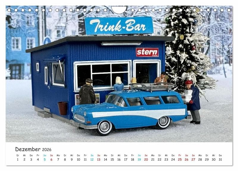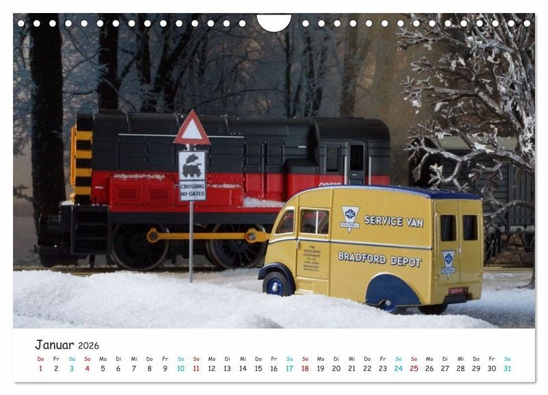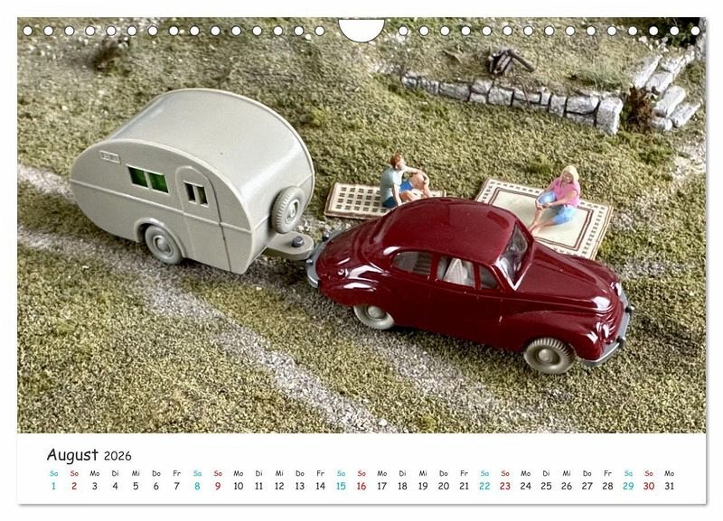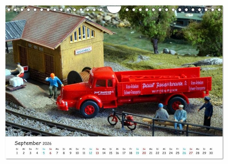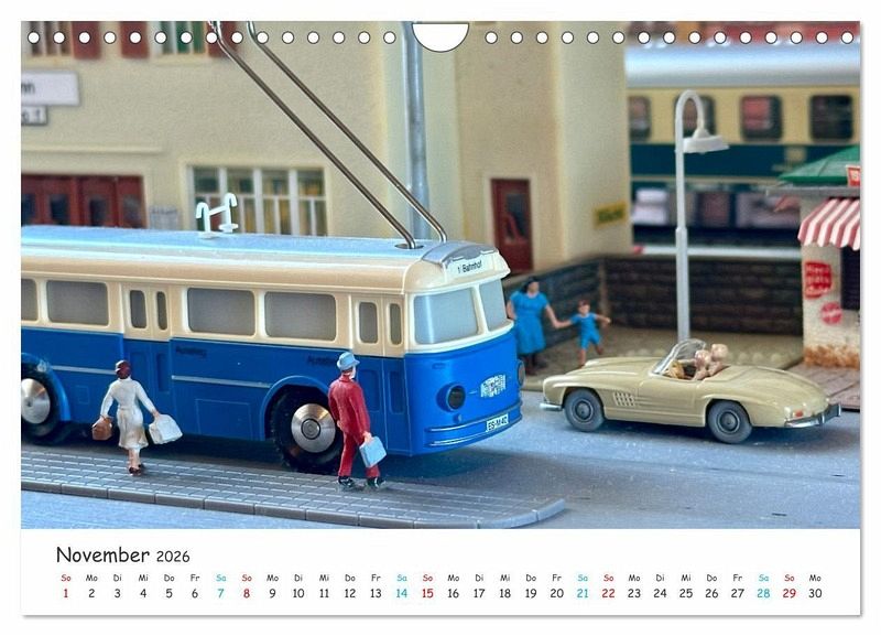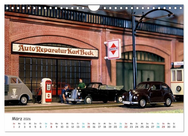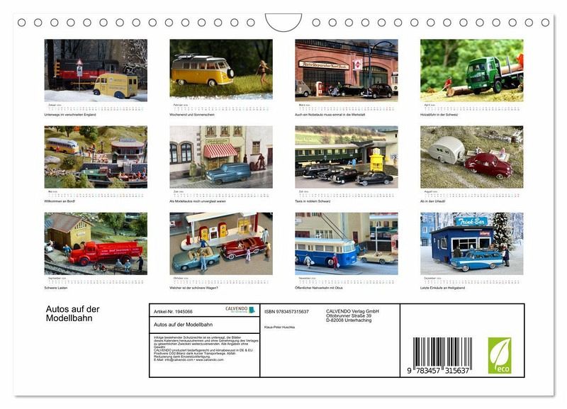 Modellautos waren von jeher unverzichtbar für die realistische Gestaltung von Modellbahnanlagen. Ursprünglich nur Zubehör, entwickelten sich die Miniaturautos bald zum eigenständigen und beliebten Sammelgebiet. In unserem Kalender sind sie in typischen Straßenszenen zu sehen.