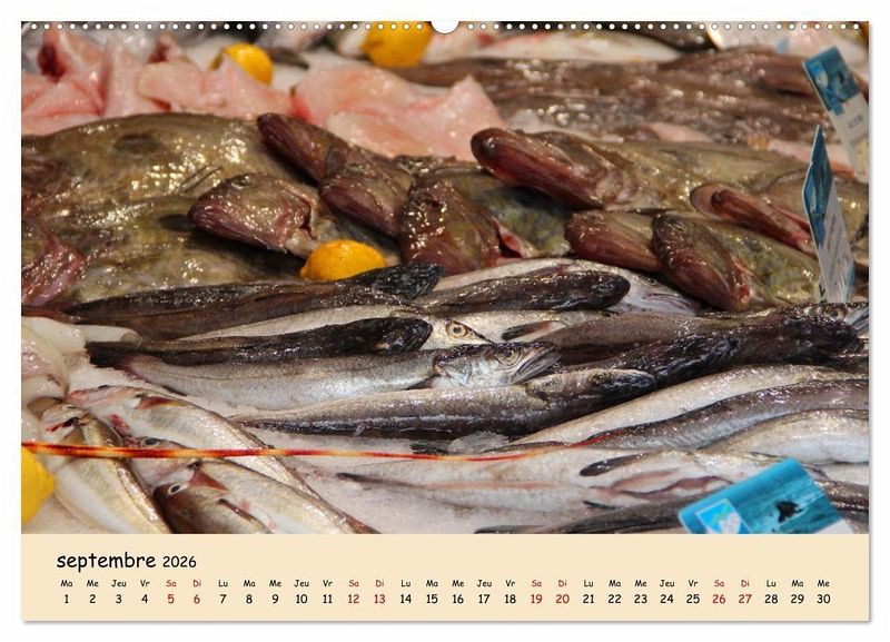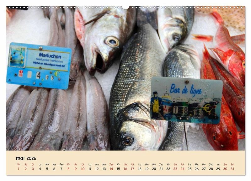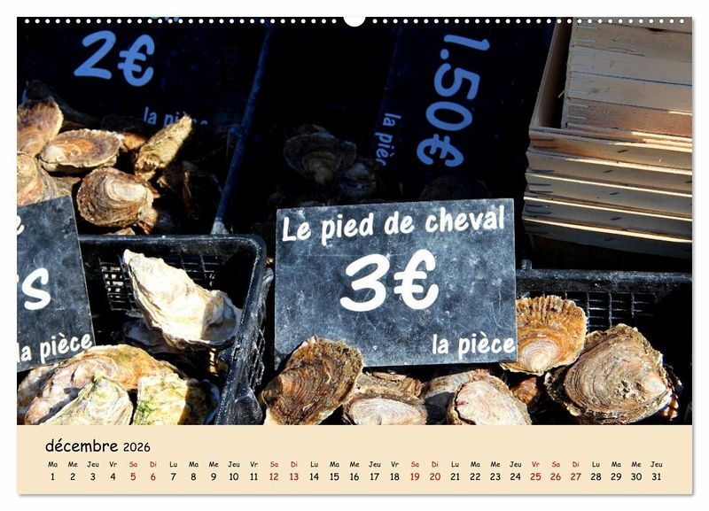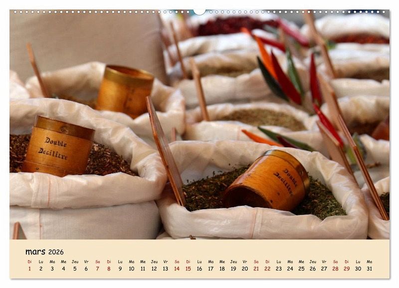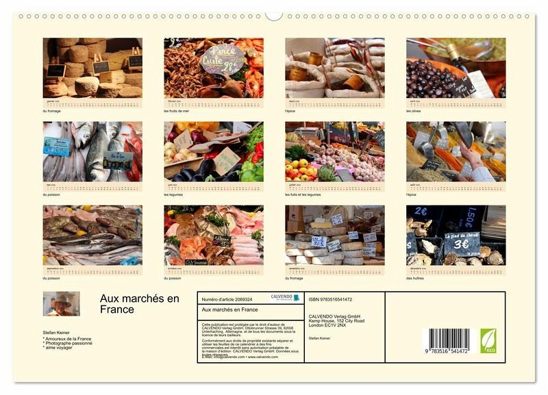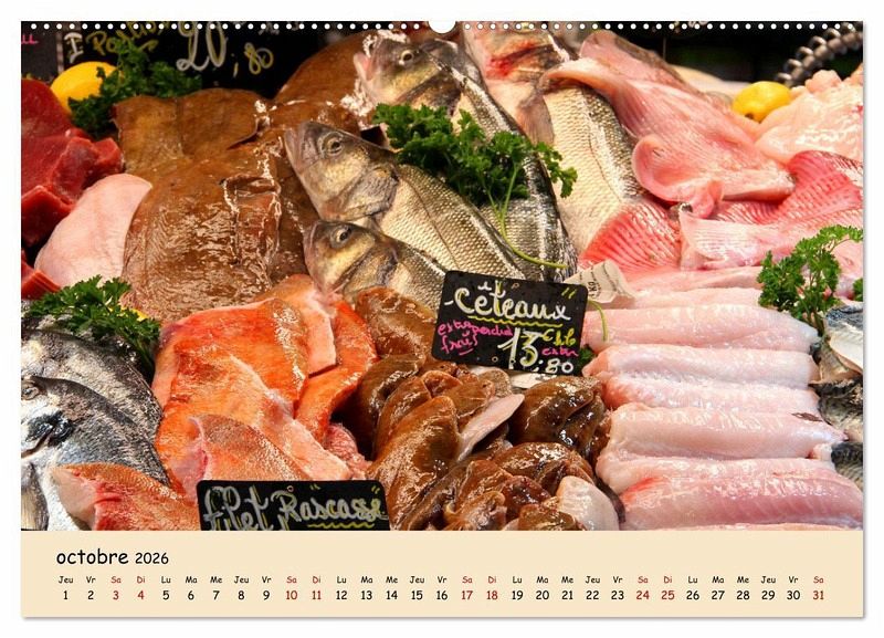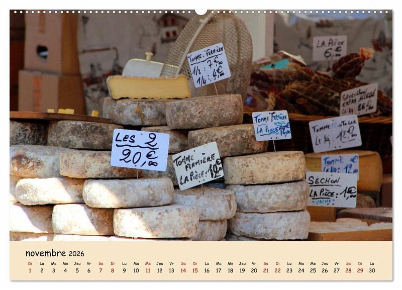 Mon calendrier contient des photos prises lors de mes visites sur les marchés hebdomadaires en France. Il existe de nombreux produits qui reflètent la cuisine et le savoir-vivre français.