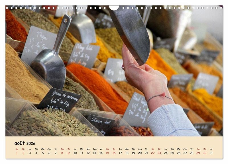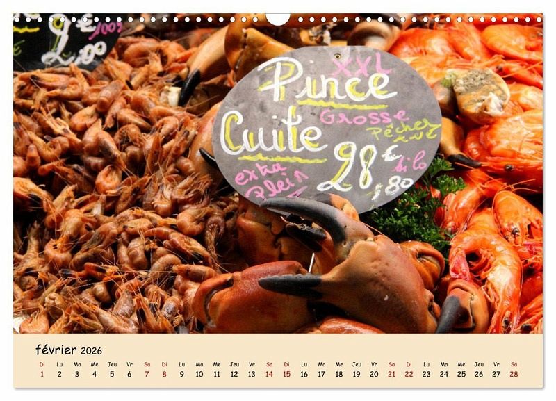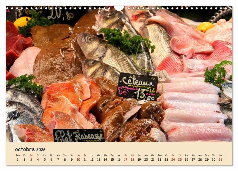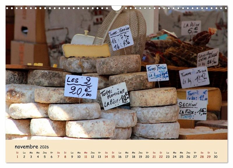Mon calendrier contient des photos prises lors de mes visites sur les marchés hebdomadaires en France. Il existe de nombreux produits qui reflètent la cuisine et le savoir-vivre français.