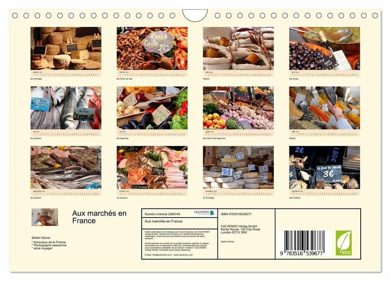 Mon calendrier contient des photos prises lors de mes visites sur les marchés hebdomadaires en France. Il existe de nombreux produits qui reflètent la cuisine et le savoir-vivre français.