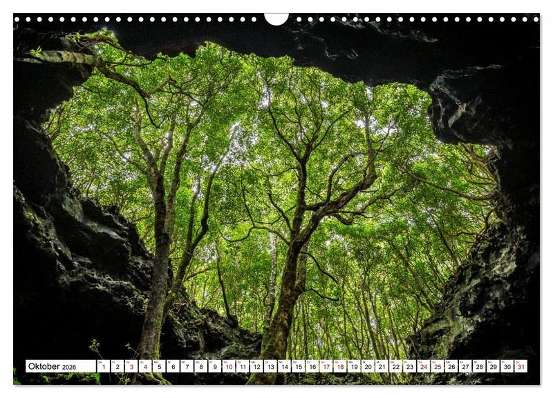 Oktober: Gruta das Torres auf Pico, Bäume wachsen durch die eingestürzte Höhlendecke