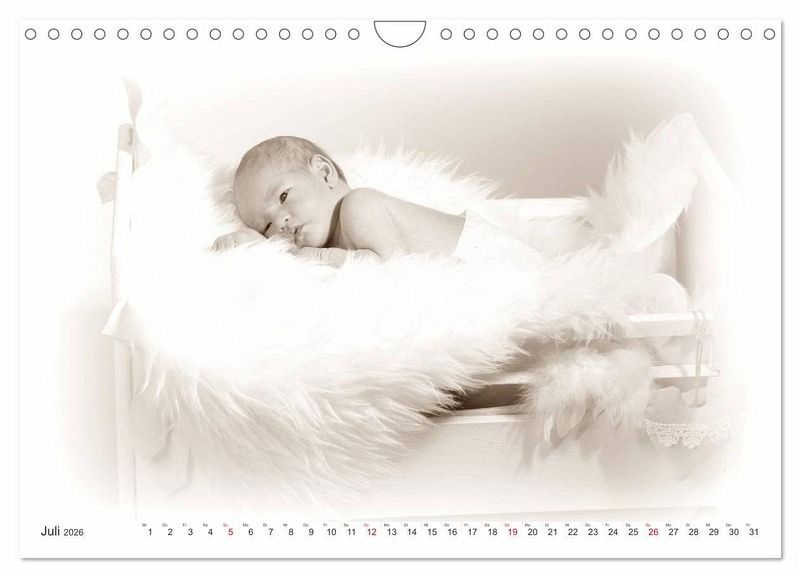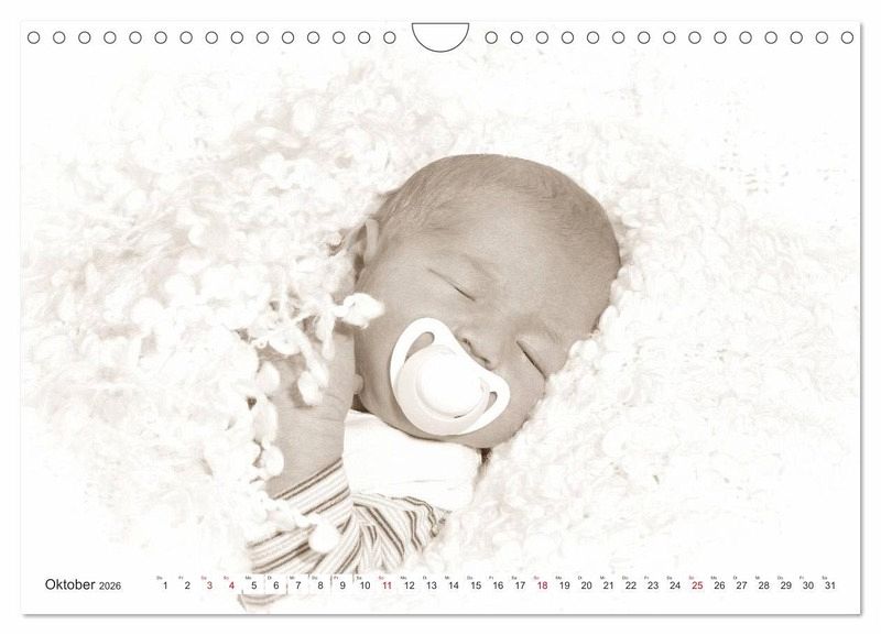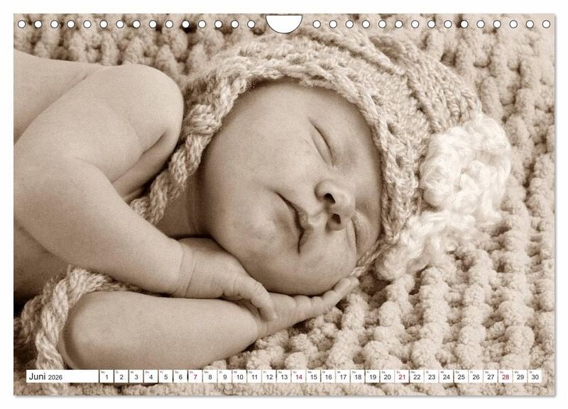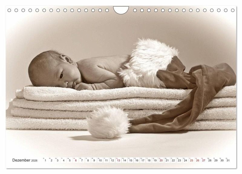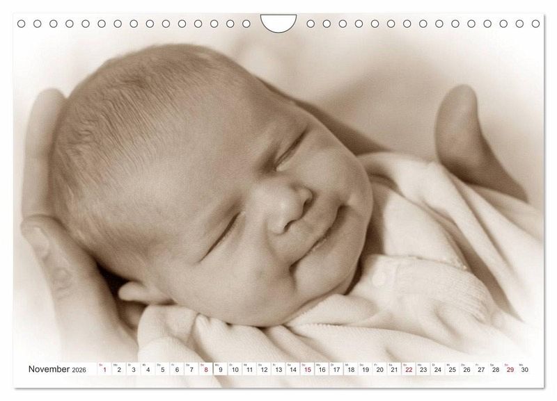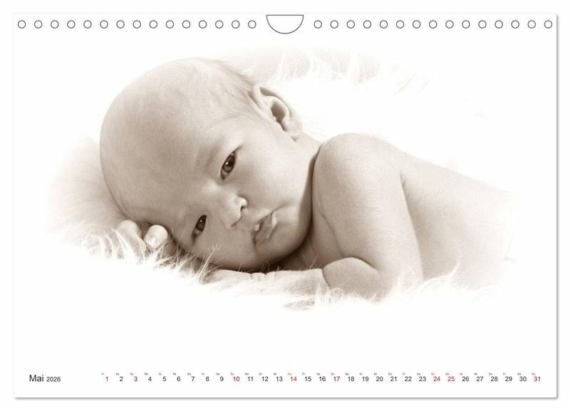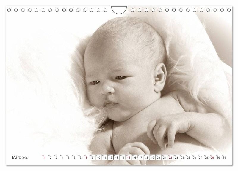 Auf 12 Seiten zeigt dieser Kalender Neugeborene in zarter Sepiatönung.