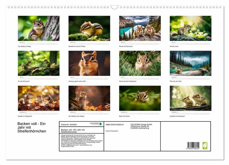 QUALITÄT - Hochwertiger Fotokalender mit 12 wunderschönen Motiven auf lichtbeständigem Bilderdruckpapier, robuste Spiralbindung mit Aufhängebügel.NACHHALTIG - deutliche Abfallreduzierung durch bedarfsgerechte Einzelstückfertigung, umweltfreundliches FSC-zertifiziertes Papier, Produktion in Deutschland, klimabewusste Logistik.PERFEKTES GESCHENK - Kalender für Freunde und Familie, für Kinder und Erwachsene, jung und alt, zu Weihnachten, Geburtstag oder zwischendurch.VIELFALT - Bildkalender in verschiedenen Formaten, z.B. DIN A5, DIN A4, DIN A3 sowie DIN A2. Ob Naturmotiv, Gemälde oder Fotos, ideal für ein persönliches Wohlfühlambiente.Frech, flink und fabelhaft gestreift - der Kalender für alle, die Streifenhörnchen lieben! von Autor(in): Simone Wunderlich