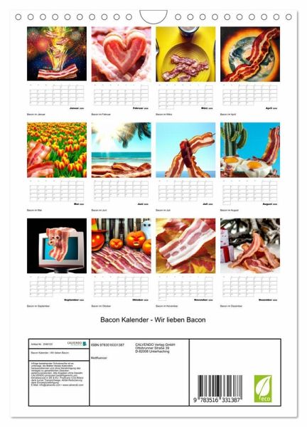 Der Bacon-Kalender - Wir lieben Bacon ist die perfekte Geschenkidee für alle, die gerne Bacon essen (nicht nur Sonntags zum Frühstück). Der Kalender hat 12 witzige Motive mit Bacon Bildern. Der Wandkalender ist auch ein Planer, so dass du deine Termine und Ereignisse immer im Blick haben.