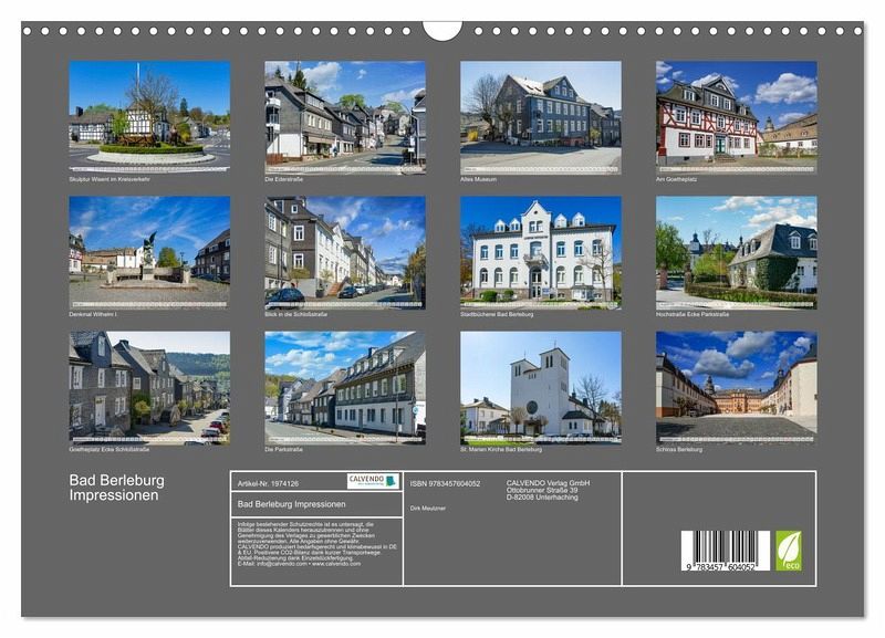 QUALITÄT - Hochwertiger Fotokalender mit 12 wunderschönen Motiven auf lichtbeständigem Bilderdruckpapier, robuste Spiralbindung mit Aufhängebügel.NACHHALTIG - deutliche Abfallreduzierung durch bedarfsgerechte Einzelstückfertigung, umweltfreundliches FSC-zertifiziertes Papier, Produktion in Deutschland, klimabewusste Logistik.PERFEKTES GESCHENK - Kalender für Freunde und Familie, für Kinder und Erwachsene, jung und alt, zu Weihnachten, Geburtstag oder zwischendurch.VIELFALT - Bildkalender in verschiedenen Formaten, z.B. DIN A5, DIN A4, DIN A3 sowie DIN A2. Ob Naturmotiv, Gemälde oder Fotos, ideal für ein persönliches Wohlfühlambiente.Zwölf eindrucksvolle Bilder der Stadt Bad Berleburg von Autor(in): Dirk Meutzner