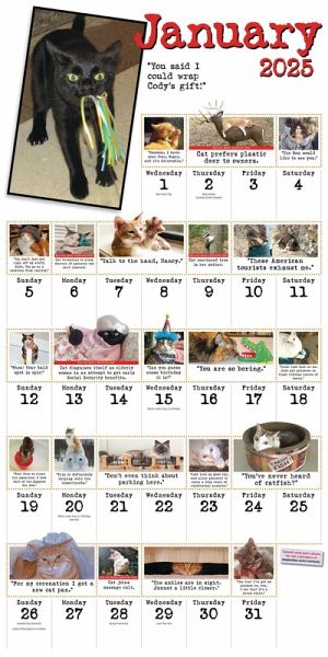 Cat-itude for your wall: hundreds of photos and hilarious captions capture cats being naughty, sassy, or downright nasty. * OFF-KILTER KITTIES: Cats meet humor (and a bit of a dark side) in this hilarious collection of cat photos and captions packed with attitude and sass. * DEVIOUS AND ADORABLE: Featured cats are so far gone they’re beyond help: one cat plots to pounce on a pair of ankles, a tuna-addicted cat plays blackjack for cans, and more. Plus, Bad Cats in Show Business, What’s That Smell?, and Bad Cat Early Warning Signs. * HILARIOUS GIFT: Bring some levity to any cat lover’s year with this fan-favorite calendar guaranteed to cause giggles. * NOW PLASTIC-FREE!: For 2025, Workman Calendars are completely plastic-free. All wall calendars are now printed with an extended paper flap closed with a fully recyclable seal – no more shrink wrap!