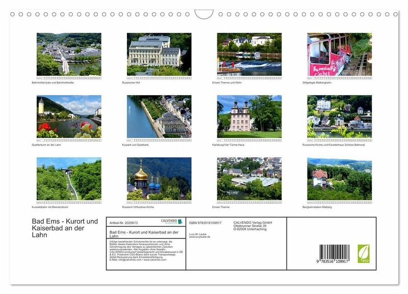 QUALITÄT - Hochwertiger Fotokalender mit 12 wunderschönen Motiven auf lichtbeständigem Bilderdruckpapier, robuste Spiralbindung mit Aufhängebügel.NACHHALTIG - deutliche Abfallreduzierung durch bedarfsgerechte Einzelstückfertigung, umweltfreundliches FSC-zertifiziertes Papier, Produktion in Deutschland, klimabewusste Logistik.PERFEKTES GESCHENK - Kalender für Freunde und Familie, fürKinder und Erwachsene, jung und alt, zu Weihnachten, Geburtstag oder zwischendurch.VIELFALT - Bildkalender in verschiedenen Formaten, z.B. DIN A5, DIN A4, DIN A3 sowie DIN A2. Ob Naturmotiv, Gemälde oder Fotos, ideal für ein persönliches Wohlfühlambiente.Wer heute in Bad Ems kurt oder urlaubt, wandelt auf den Pfaden vieler berühmter Kurgäste. von Autor(in): Lucy M. Laube