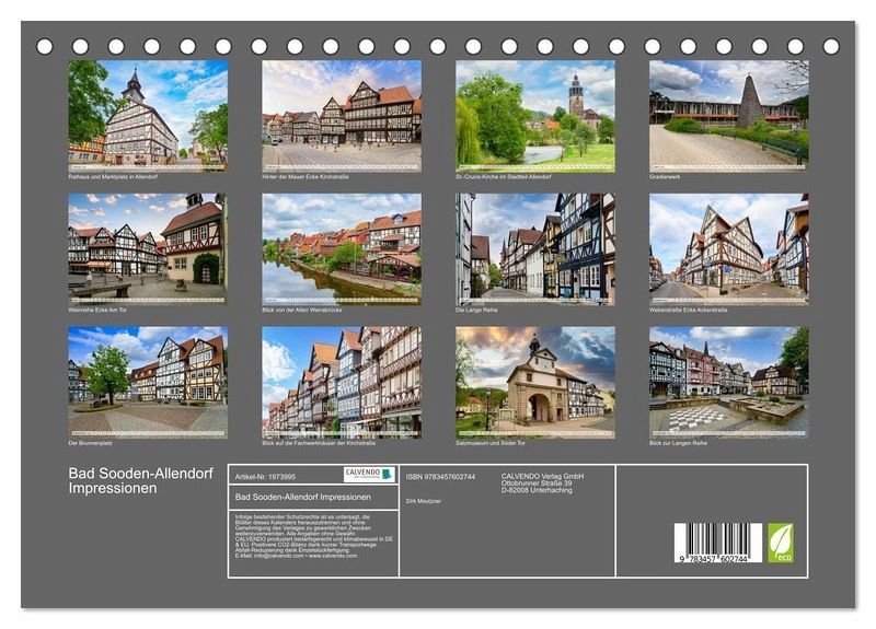 Gehen Sie mit auf eine fotografische Reise durch die wunderschöne Stadt Bad Sooden-Allendorf. Auf zwölf beeindruckenden Bildern, des Fotografen Dirk Meutzner zeigt der Kalender einige Sehenswürdigkeiten dieser Stadt Lassen Sie sich einfach verzaubern! Dieser Kalender eignet sich auch hervorragend als Geschenk für Freunde, Bekannte und Verwandte.