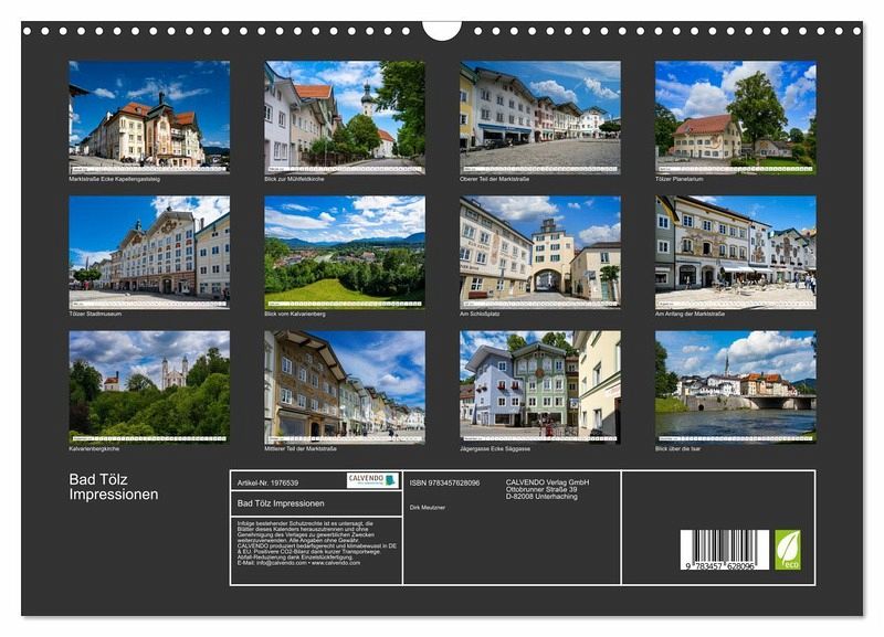 Der Fotograf Dirk Meutzner nimmt Sie mit in die einmalige Stadt Bad Tölz. Gelegen in einer wunderschönen malerischen Landschaft ist sie die Kreisstadt des oberbayerischen Landkreises Bad Tölz-Wolfratshausen. Die Kurstadt liegt an der Isar rund 50 Kilometer südlich von München. Dieser einmalige Wandkalender eignet sich auch wunderbar als Geschenk für Ihre Verwandten und Bekannten.