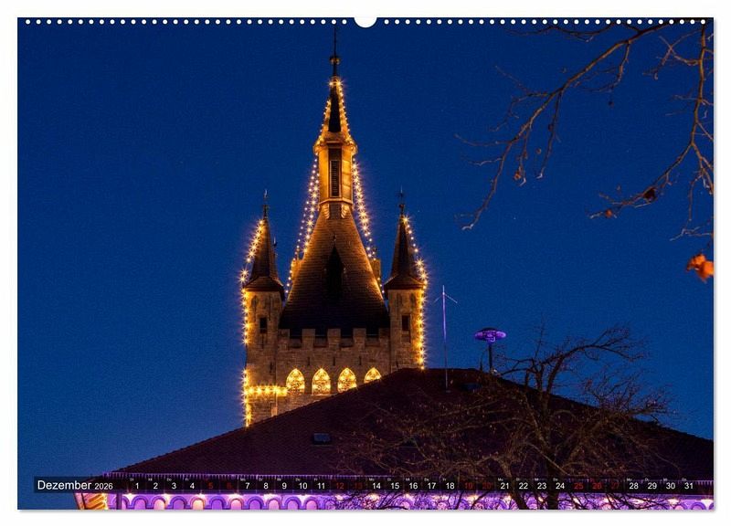 Dezember: Blauer Turm mit weihnachtlicher Beleuchtung