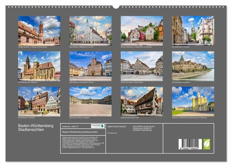 Es erwarten Sie zwölf einmalig schöne Bilder, verschiedener Städte, des Bundeslandes Baden-Württemberg. Sie werden erstaunt sein über die einmalige und wunderbare Landschaft und die historischen Gebäude. Der Fotograf Dirk Meutzner hat versucht Sie eindrucksvoll in seinen Bildern dazu stellen, was ihm auch gelungen ist.