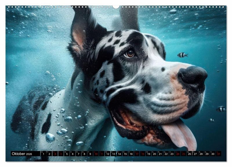 Oktober: Vor der Nase einer schwarz-weißen Deutsche Dogge schwimmt ein schwarz-weißer Fisch